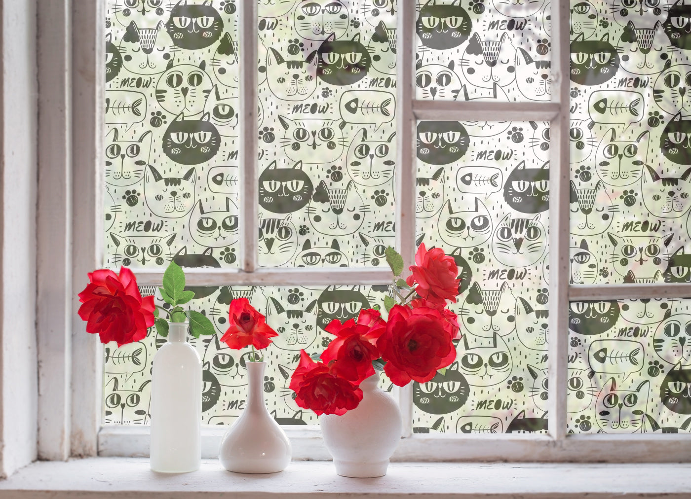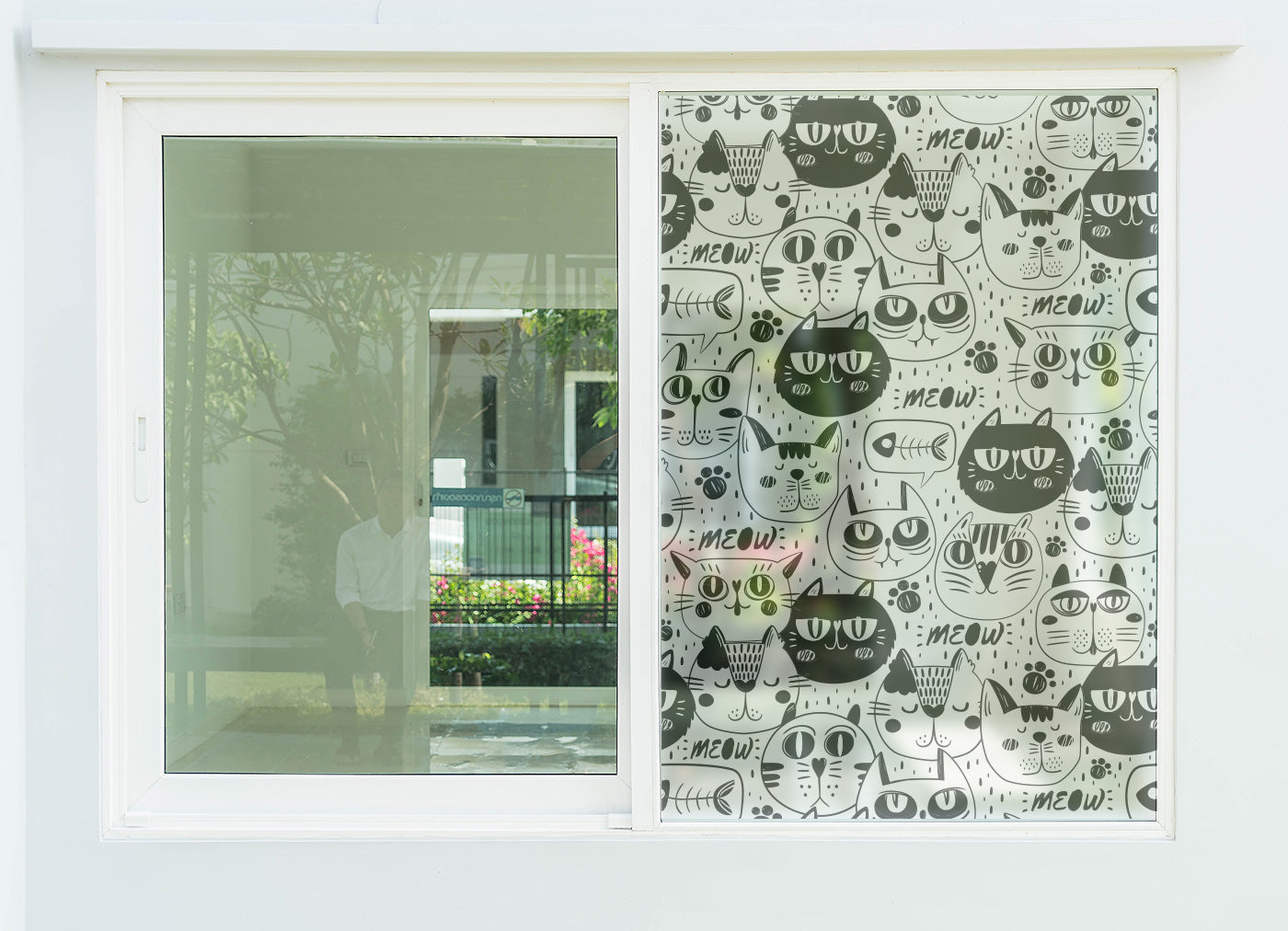 Featuring a bustling pattern of unique, hand-drawn cats in a classic black and white doodle style, this film is guaranteed to make you smile. You'll discover cats with all sorts of expressions, cats with glasses, cute paw prints, and tiny "MEOWs" peppered throughout the design. The frosted finish provides excellent privacy, blocking unwanted views from the outside, while still allowing soft, natural light to filter through and brighten your room. The reliable self-adhesive backing ensures a smooth, easy application and a durable hold for years of whimsy.