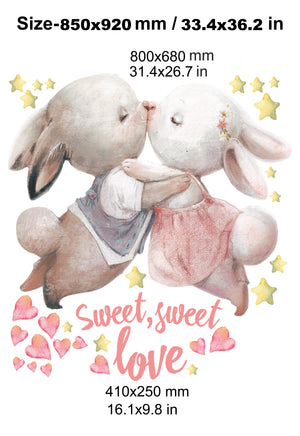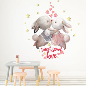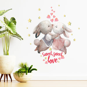 Capture a moment of pure, storybook romance with our enchanting Starry-Eyed Bunnies Wall Decal. This incredibly sweet design features two darling bunnies, lost in a tender embrace and sharing a gentle kiss as they float through a dreamy sky. Rendered in a beautiful, soft watercolor style, they are surrounded by a sprinkle of glowing stars and a cascade of loving hearts. Below, the message "Sweet, sweet love" in a charming red script perfectly captures the heartwarming and innocent affection of the scene.